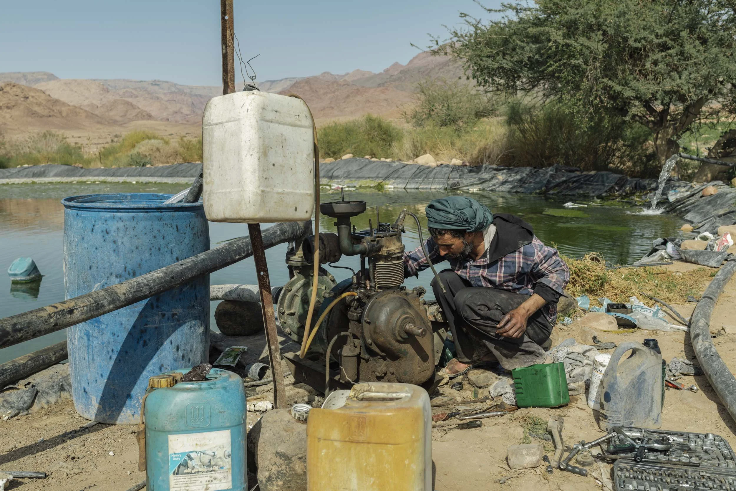 Mohammed is repairing the irrigation system and pump for a watermelon farm in the Wadi Araba desert, Jordan.